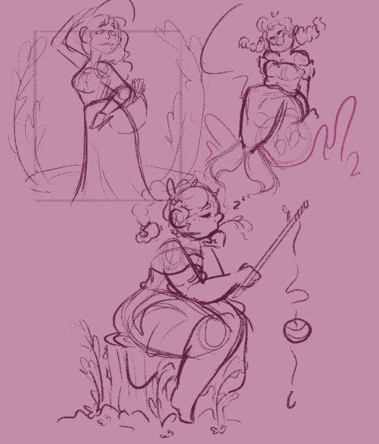 Hi Quincy, these are a great start. I've been trying to get them to agree to a mermaid for 4 years. If you could develop that one, plus your favourite out of the other two, that should get us closer. For the woman fishing, could you place her on the end of a dock or change the stump to a free standing dock post in the water, perhaps something left over from an old dock? They really like to play up the "lake life" aspect of their brewery.