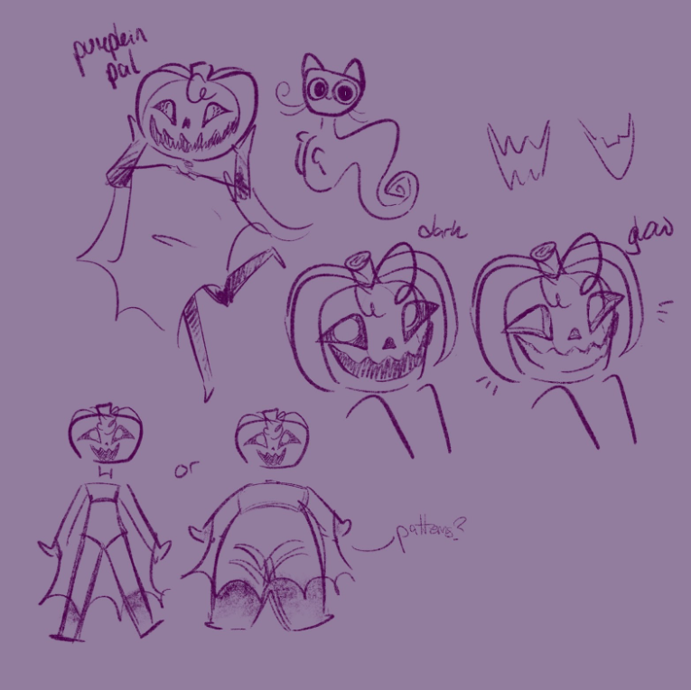 Here’s the working sketch I have for the Halloween character for the posters.I was just thinking of a little pumpkin ghost with a fun shall and maybe a little cat ghost companion.