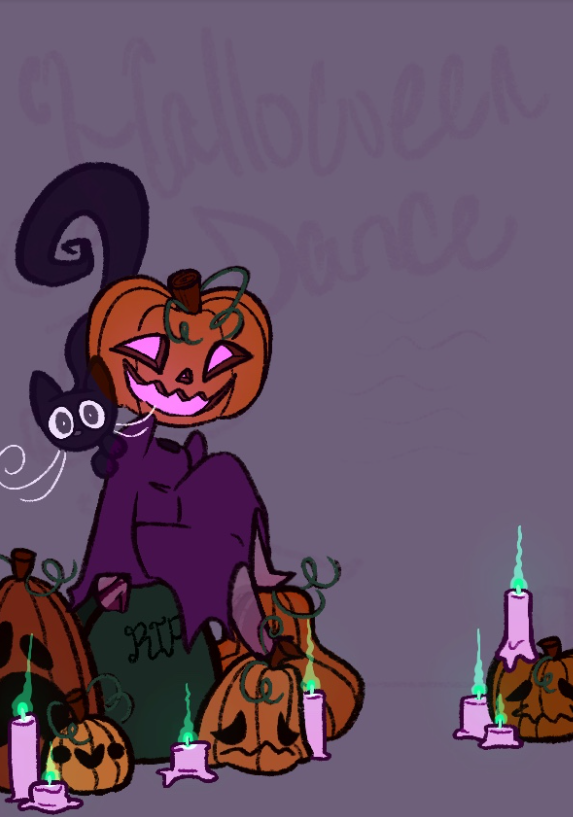 We'd like to have a main character like a witch or vampire, something that quickly represents Halloween. Also could you add jack-o-lanterns, bats, cats, etc? No background needed, but shouldn't be blank white. Include "Halloween Dance" as the main title—all other text should be visible, but smaller.